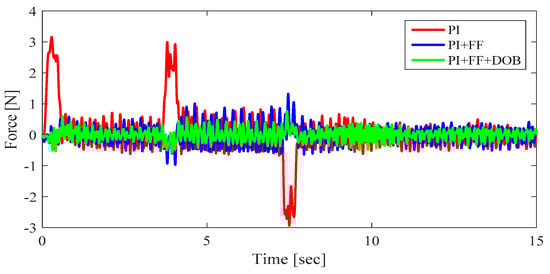 Figure 11 shows the results of applying the proposed control scheme in the case of signal processing with KF. Particularly, the tracking performance of the FF controller was powerful in the transient section where the tension changes. Moreover, the experimental results demonstrate that the DOB is effective in compensating for disturbance and model uncertainty.