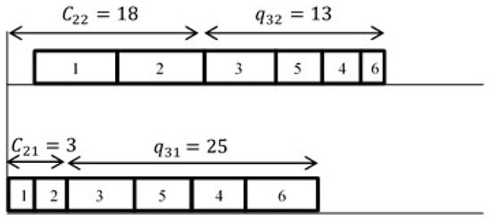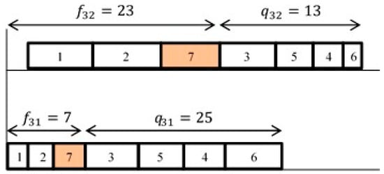 According to the Johnson’s algorithm [], the optimal solution is with Now, suppose that we remove job 7 and obtain the partial solution, . Suppose that we insert job 7 into position of the partial solution to obtain the optimal solution. We follow the speed up method now: