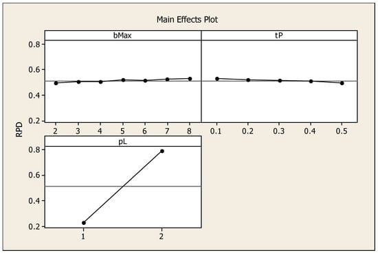where is the makespan value generated by the VBIH algorithm in each treatment and is the minimum makespan value found amongst 70 treatments. For each job size-treatment pair, the average RPD value is calculated by taking the average of five instances in each job size. Then, the response variable (ARPD) of each treatment is obtained by averaging these RPD values of all job sizes. After determining the ARPD values for each treatment as mentioned above, the main effects plots of the parameters are analyzed and given in Figure 3.
