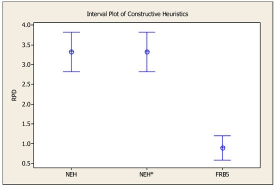 IG algorithm was also applied to PFSP with different objective functions such as total tardiness criterion [,]; total flowtime criterion []. In [], they carried out an exhaustive review and computational evaluation of heuristics and metaheuristics published until 2017 for the PFSP to minimize the makespan. Therefore, for the further analysis of the literature of PFSP, the indicated manuscript [] should be examined.