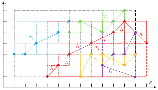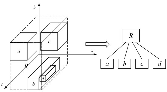 Although the trajectory segment-based method can improve the pruning precision, in the pruning process, it is necessary to traverse the drtree once for each trajectory segment of Tq, resulting in a large increase in node traversal overhead. In order to reduce the node traversal overhead, we also organized all the trajectory segments contained in Tq by a spatiotemporal index called qrtree. In the pruning step, drtree and qrtree are traversed at the same time, this makes it possible to generate a precise pruning result without having to traverse the drtree multiple times, thus effectively reducing the overhead of traversing the nodes. The traversal algorithm will be discussed separately in Section 4.3, this section first describes the index structure used by qrtree.