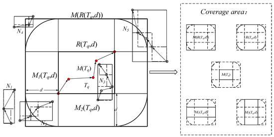 To overcome this problem, an intuitive method is to further check the drtree node that has passed the check of Pruning strategy 1 by calculating Mindist. However, as mentioned earlier, Mindist calculation requires a lot of CPU time and should be avoided during the pruning process. In this regard, we consider the property to be one or more rectangular areas that are fully covered by , if overlaps with any of them, then . Further, to ensure the pruning effect, these rectangular areas should fully cover . Such a rectangular spatial area can be obtained by expanding the spatial range of each dimension of by using d. Assuming that the coordinates of the lower left corner and the upper right corner of are and , respectively. Therefore, the coordinates of the lower left corner and upper right corner of are and , and the coordinates of the lower left corner and upper right corner of are and . It is easy to know that and are fully covered by , and is fully covered by them. Hence, we obtain Pruning strategy 2.