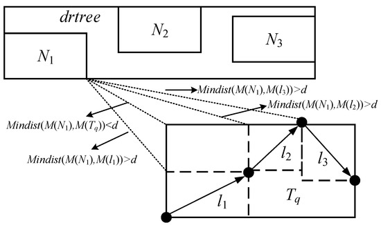 Compared with the pruning method with taking the whole query trajectory as the pruning reference object, the pruning method with taking each trajectory segment of it as the reference one can obtain more accurate pruning results. This is because the invalid space of the MBRs which enclose the trajectory segments is less than that of the MBR which encloses the whole trajectory. For example, in Figure 5, the Mindist between the MBR of drtree node N1 and is smaller than d, but the Mindists between the MBR of the N1 and the MBRs of the trajectory segment l1 is greater than d. Therefore, N1 does not satisfy the candidate requirement of l1, and it is not necessary to calculate the distance between any trajectory segments contained in N1 and l1 in the refinement step.