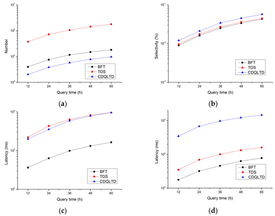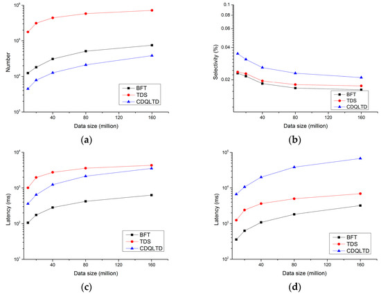 Figure 9 shows the query performance of the three different methods at different time ranges. It can be seen from Figure 9a that as the query time range increases, the number of candidates involved also increases, and all three methods need to access more nodes to obtain candidates. Figure 9b shows that the change in selectivity is proportional to the change in the time range, this is because the increase in the number of candidate segments will naturally increase the selectivity when the data size is constant. As shown in Figure 9c,d, since all three methods require more time to generate and process the candidate segments, their pruning latency and query latency increase with the increase of time range. Among the three methods, BFT has the best query performance. In all cases, BFT takes less than eight seconds to complete the query process, while the time spent by CDQLTD gradually increases from 34 s to 134 s. The reason for this difference in performance has been explained in Section 5.2, it will not be described in detail here.