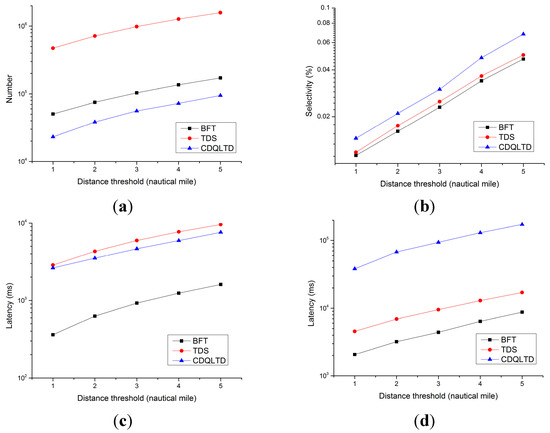 This part of the experiments evaluated the query performance of different distance thresholds, as shown in Figure 10. As the distance threshold increases, the query spatial range of query increases, and the increased speed shows an increasing trend. It causes more index nodes and trajectory segments to be accessed and checked, and the pruning results contain more candidates. As shown in Figure 10a,b, the growth rate of the number of accessed nodes, and that of selectivity will also increase. Naturally, when the distance threshold is increased from one nautical mile to five nautical miles. It can be seen from Figure 10c,d that the pruning latency and query latency of the three methods also increases. Among them, the performance of BFT is still better than that of the other two. In terms of pruning latency, it takes less than one-fifth of the two methods. In terms of query latency, it takes less than half of that of TDS, and is an order of magnitude smaller than that of CDQLTD.