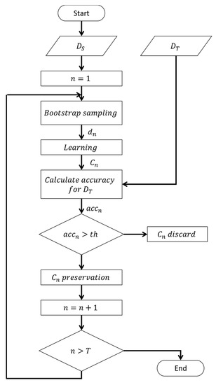 TrBagg was utilized in the proposed method because bagging offers a solution for inductive transfer learning. TrBagg is an example-based approach to transferring knowledge based on data. That is, among the item of the source domain, the item that is effective for classification of the target domain is selectively used. Since the respective data items in the two domains have different distributions and/or definitions, it is impossible to directly compare data items with each other. Therefore, TrBagg determines whether the classifier learned from part of the source domain has enough classification accuracy for the target domain, and the data to be used is selected via the classifier.