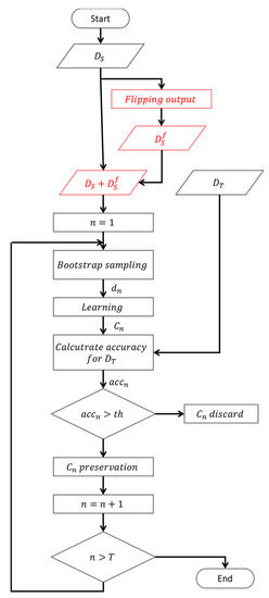 Here we describe the proposed method involving flipping output. The method is based on TrBagg. First, a source domain , including data with different labels, is generated using flipping output. Then the two source domains and are combined to generate a new source domain . Next, training datasets are generated from by bootstrap sampling. Learning from the generated individual datasets, classifiers are generated. Among , classifiers whose experience error is less than the threshold with respect to are adopted as . If the experience error of a classifier is higher than , the classifier is discarded.