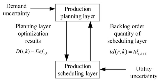 In this paper, the integrated model of production planning and scheduling considering demand uncertainty and utility uncertainty is solved based on the integrated optimization method and rolling horizon optimization strategy. The solving method of integrated optimization is to construct a bi-level integrated model of planning and scheduling to deal with the demand and utility uncertainties. As the uncertainty of demand and utility are different in time scales, it is necessary to deal with the uncertainty of demand and utility in production planning layer and scheduling layer respectively. The discrete-time model is established in the production planning layer, and chance constrained programming is used to describe demand uncertainty. The continuous-time model is established in the production scheduling layer, and fuzzy theory is used to describe utility uncertainty. When the planning layer completes the Kth optimization, the optimization result corresponding to the first planning period is equal to . Parameter is assigned as a task to the scheduling layer. The double-layer structure of production planning and scheduling is shown in Figure 2.