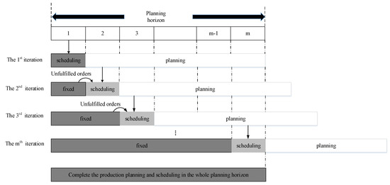 Rolling horizon optimization strategy is a general time decomposition method. The planning horizon of the discrete-time model in the planning layer is composed of planning periods with equal time durations. The scheduling horizon of the continuous-time model in the scheduling layer is equal to the length of the planning period. The rolling horizon optimization strategy is used to iteratively solve the integrated model of production planning and scheduling. The specific steps of rolling horizon optimization strategy are as follows: