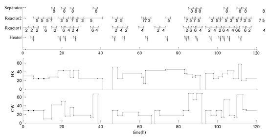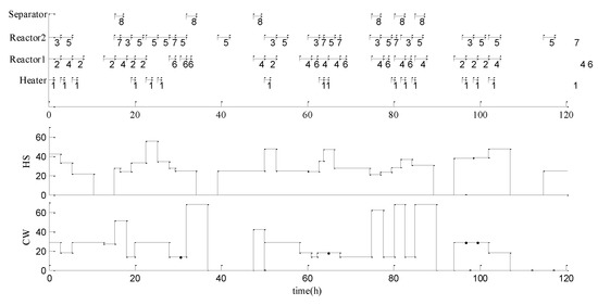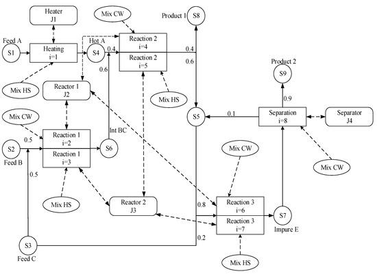 The classical example [40] was used to verify the feasibility and effectiveness of the two-layer integrated model of planning and scheduling in dealing with the uncertain problems of demand and utility based on the RTN representation. The example uses RTN representation to describe the production process, as shown in Figure 5. The three raw materials S1, S2 and S3 produce two products S8 and S9 through a series of endothermic and exothermic reactions, in which the endothermic reaction requires high-pressure steam (HS) and the exothermic reaction requires condensed water (CW). Due to the limitations of the energy system, the average supply of HS and CW is 64 and 69 kg/min, respectively. Heating can be performed on heater J1. Reaction 1 can be performed on reactors J2, J3. Reaction 2 can be performed on reactors J2, J3. Reaction 3 can be performed on reactors J2, J3. Separation can be performed on separator J4. The study involved a total of eight different production processes. Unlimited storage policy is adopted for raw materials and products, and limited storage policy is adopted for intermediate materials [41,42]. The relevant data of the calculation example are shown in Table 1, Table 2 and Table 3.