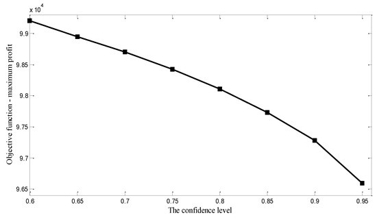 The stochastic programming with chance constraints is introduced into the production planning layer to describe the uncertainty of demand. Through a series of mathematical transformation, the uncertain model with chance constraints can be transformed into a deterministic model with specified confidence level. Different confidence levels have a very important impact on the optimization results. The objective functions under different confidence factors are shown in Table 4. The value of the confidence factor in the part of integrated model simulation analysis is 0.9. The variation trend of maximum profit under different confidence levels is shown in Figure 6.