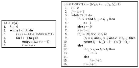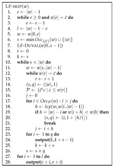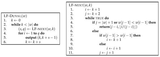 Suppose that we have a procedure LF-next which computes, given a word w and an integer k, the pair where s is the largest integer such that and q is the largest integer such that , for . The factorization of w can then be computed by iteratively calling LF-next starting from position 0. When a given call to LF-next returns, the factorization algorithm outputs the intervals , for , and restarts the factorization at position . Duval’s algorithm implements LF-next using Lemma 3, which explains how to compute, given a word and a symbol , whether , and thus makes it possible to compute the factorization using a left to right parsing. Note that, given a word with , we have and with and . For example, if , we have , , , and . The code of Duval’s algorithm is shown in Figure 1. The algorithm has -time and -space complexity.