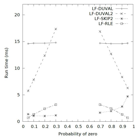 Testing LF-rle. To assess the performance of the LF-rle algorithm, we tested it together with LF-Duval, LF-Duval2 and LF-skip2 for random binary sequences of 5 MB with different probability distributions, so as to vary the number of runs in the sequence. The running time of LF-rle does not include the time needed to compute the RLE of the sequence, i.e., we assumed that the sequence is given in the RLE form, since otherwise other algorithms are preferable. For each test we generated 100 sequences, and each run with each sequence was repeated 500 times. The average run times are given in Table 3 which is shown in a graphical form in Figure 5.
