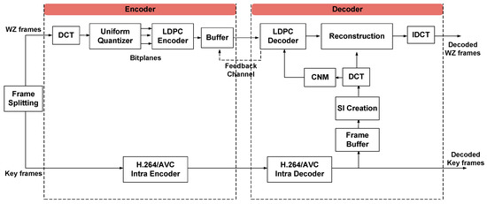 The DISCOVER DVC codec [10] is one of the most efficient codec in literature and the most widely used as a reference benchmark for evaluating the performance of a DVC codec [7] among the different DVC codecs following the Stanford architecture. In DISCOVER DVC, the input video is separated into two parts: the key and WZ frames. The key frames are encoded while using conventional H.264/AVC Intra coding, due to its low-encoding complexity, and the WZ frames are coded while using WZ coding scheme, as shown in Figure 1. Typically, the key frames are periodically inserted with a certain GOP size. Most of the results available in the literature use a GOP size of 2, which means that odd and even frames are the key and WZ frames, respectively. For each WZ frame coding, an integer 4 × 4 block-based Discrete cosine transform (DCT) is applied prior to quantization. The quantized values are then split into bitplanes, which go through a low density parity check code (LDPC) encoder, as shown in Figure 1.