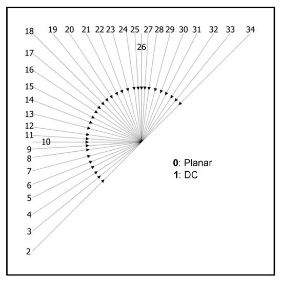 Figure 3 illustrates all of the prediction modes utilized for the proposed JEM based key frame coding in detail. In Figure 3, 33 angular modes are numbered from 2 to 34, and each represents a distinct direction. Among them, special modes 10 and 26 are referred to as Horizontal and Vertical, respectively. The non-angular modes 0 and 1 are Planar and DC, respectively, which are defined as the same as in the H.265/HEVC Intra coding [15]. Additionally, in the case of CU coding with several candidates of sizes, such as 64 × 64, 32 × 32, 16 × 16, and 8 × 8, it is reported from our experimental results that a larger is suitable for flat and homogeneous regions. Additionally, for these regions, DC, Planar, and simple directional modes (e.g., Vertical and Horizontal modes) are the most likely to be chosen as the best mode candidate. In contrast, a smaller is suitable for high activities and significantly detailed regions. Therefore, the exhaustive mode searching for all candidates of CU sizes is unnecessary, since it is very time consuming and complex.