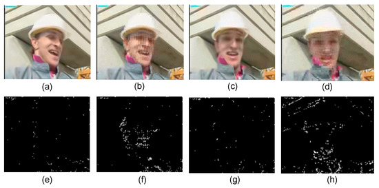 Figure 5 shows an example for the problem of quality fluctuation. In Figure 5, the subjective quality of the () decoded key and WZ frames of Foreman sequence are shown. These frames are encoded using the DISCOVER DVC coder. The error or distortion images in Figure 5e,g show the differences between the () original key and decoded key frames, respectively, and Figure 5f,h show the differences between the () original WZ and the decoded WZ frames, respectively. The decoded WZ frames generally contain much higher distortion areas as compared to the decoded key frames do, as illustrated in Figure 5. In other words, the image quality of the decoded key frame is generally much better than that of the decoded WZ frames.