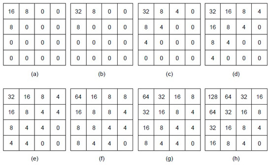 It is necessary to propose a new scheme that can control more effectively the quality of both key and WZ frames than the prior traditional schemes in order to solve the problem, especially for the new architecture employed in JEM-DVC. Generally, the coding rate and the quality of the decoded key and WZ frames are controlled while using QPs and QMs, respectively, where the key frame is encoded while using a set of QPs ranging from 0 to 51, while the WZ frame is encoded using the fixed set of eight QMs, [12]. Figure 6 shows the fixed set of QMs, . In Figure 6, matrix represents the lowest bitrate (and the highest distortion) situation, while matrix corresponds to the highest bitrate (and thus lowest distortion). Within a 4 × 4 quantization matrix, the value at position in Figure 6 indicates the number of quantization levels that are associated to the DCT coefficients band . These quantization matrices are utilized to determine the rate-distortion performance of a DVC coder and they are assumed to be known by both the encoder and decoder. More details on the description of QMs can be referred to in [11].