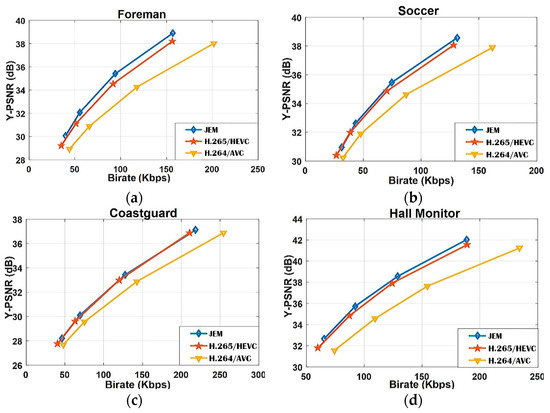 Key frame coding evaluation with different codecs: H.265-DVC, DISCOVER DVC, and the proposed JEM-DVC performed on different test sequences: (a) Foreman, (b) Soccer, (c) Coastguard, and (d) Hall Monitor.