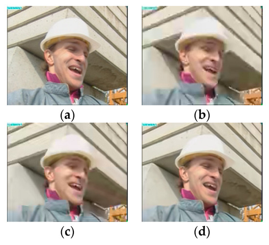 The error or distortion images in Figure 8e–g show the differences between the original key frame and the decoded frames. As shown in Figure 8, both the DISCOVER DVC, H.265, and JEM-DVC codecs can provide a good image quality with a small distortion for the decoded key frame as compared to the original frame. However, for the decoded WZ frame, the performance of DISCOVER DVC codec is critically degraded due to annoying artefacts that were seen around the face of the Foreman, as shown in Figure 9b. Correspondingly, the WZ coding scheme of the DISCOVER DVC generally introduces much higher distortion areas in the decoded WZ frames as compared to the key frame coding scheme. This leads to the fluctuation in the video quality playing over the decoded key and WZ frames.