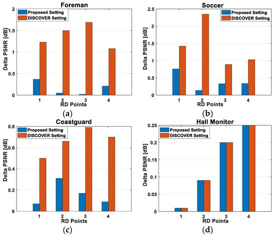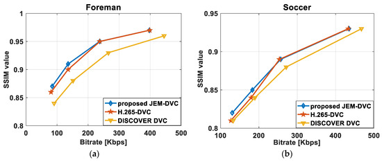 Figure 11 shows the overall PSNR performance of the H.265-DVC, DISCOVERY DVC, and JEM-DVC codecs obtained for Foreman, Soccer, Coastguard, and Hall Monitor test sequences. As can be seen in Figure 11, for all of the test video sequences, the proposed JEM-DVC consistently provides better performance than the H.265-DVC and DISCOVERY DVC codecs. For example, as indicated in Figure 11c, for the Hall Monitor sequences, the proposed JEM-DVC provides up to 0.4 dB and 2.1 dB gains as compared to the H.265-DVC, DISCOVER DVC, respectively.