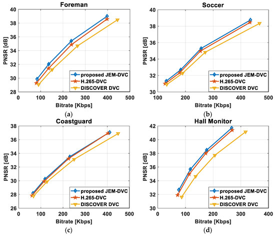 Comparisons of overall rate-distortion (RD) performance obtained by H.265-DVC, DISCOVER DVC, and the proposed JEM-DVC with different test sequences: (a) Foreman, (b) Soccer, (c) Coastguard, and (d) Hall Monitor.