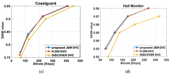 Comparisons of overall visual quality measurement using SSIM metric obtained by H.265-DVC, DISCOVER DVC, and the proposed JEM-DVC with different test sequences: (a) Foreman, (b) Soccer, (c) Coastguard, and (d) Hall Monitor.