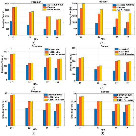 Comparisons of complexity for encoding time (s) obtained by each DVC scheme and video coding standards (Intra and No motion) with different test sequences: (a–f) Foreman and Soccer.
