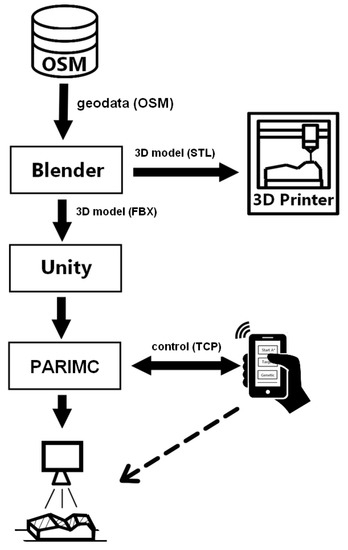 Figure 1 shows a diagram representing the main components of the whole system. It also shows the main data flows and communication protocols used. The process starts with selecting the relevant geodata and exporting them from OpenStreetMap. The data are then imported to Blender 3D modeling software for building the 3D model. The model created in Blender is then used to create the physical model, by printing in a 3D printer or using a similar method. In the present project, it was created using thin wood pieces, cut in a precision laser cutter. The same Blender model is also imported in Unity, where it is refined and the Artificial Intelligence algorithms are programmed. The final application programmed in Unity was named Projected Augmented Reality Intelligent Model Control (PARIMC). It also provides a user interface from a cell phone, tablet, computer or similar device. Users can then interact with the application, adjust different parameters and see the results projected on the 3D physical model.