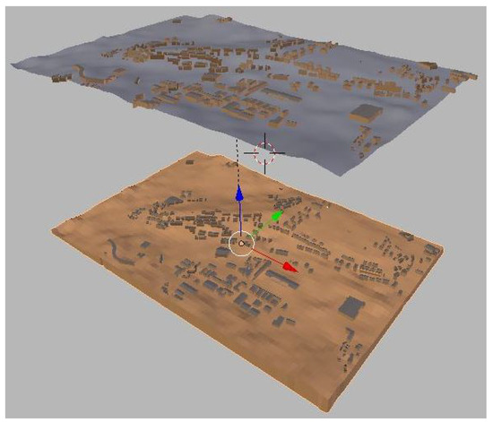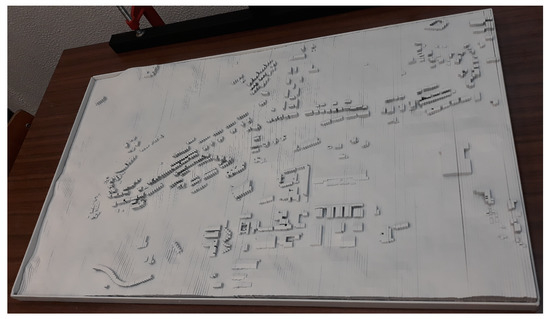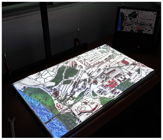 Raskar et al. [16] propose a PAR system to augment prototype buildings. But Raskar’s approach requires a number of different projectors. Their focus is on the buildings themselves. In that regard, Raskar’s approach is similar to Xaviéra & Leclercq’s [17], who developed a PAR system for architectural design, as described in Section 1. PARIMC uses just one projector above the scene, so the setup and calibration of the system is very simple. Plus, there are fewer shadows using just one projector. In PARIMC, the 3D effect comes from a model of the terrain which must be printed using geodata data from OSM or an equivalent database. The scale is also larger than in previous models, such as Raskar or Leclercq’s models, which focus on small solids rather than large areas of terrain. In PARIMC, the changes expected in altitude are small and the surface of the terrain gradually changes over large areas, except for the height of the buildings, which represent sudden vertical changes.