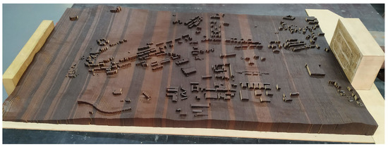 In order to create the physical model, the initial idea was to print the virtual model in a 3D printer, using PLA filament. The goal was to make a model with horizontal dimensions cm and a minimum width of 3 mm. Because of its size, it could be printed in eight pieces of cm each piece, for the most common 3D printers available can print a maximum of about 20 cm. However, in the 3D printers available for the project, each piece would take about seven hours to print, on average. During those seven hours problems may occur, damaging the whole work and forcing it to restart again. Therefore, to get faster results and also reduce costs, the choice was made to use a precision laser cutter and cut 250 wood pieces, to use as slices of the model. The final size is therefore cm, with a maximum height of 3.74 cm. Figure 4 shows the physical model after the pieces of wood were cut and put together. The raw wood had different shades of brown, so it was not appropriate for color restitution in the projection environment. In order to make the pieces usable, they were framed in an iron structure and painted with white matte paint before being used. Figure 5 shows the 3D map framed and painted white. Figure 6 shows the final result, with the projection of the city objects over the wooden physical model. Behind the wooden structure there is the computer screen in the background, for comparison of the dimensions and other visual aspects.
