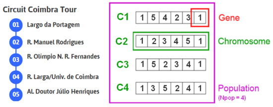 For the example population of Figure 7, the fitness of chromosome C1 is the sum of the distances traveled to visit places 1–5–4–2–3–1, through the paths determined by A*. The fitness for C2 is the sum of the distances necessary to travel in a different order, starting with going from place 1 to place 2, then 3, then 4, then 5 and then getting back to 1.