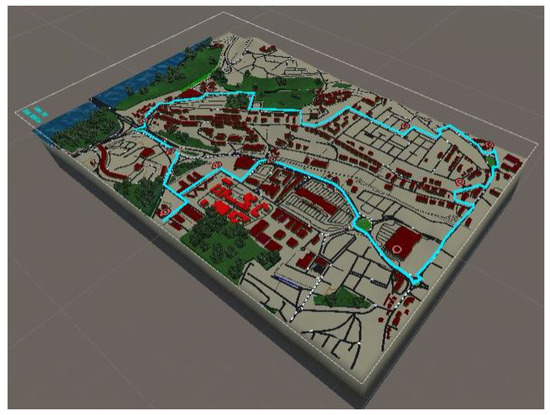 The georeferenced data to create the model was obtained from OpenStreetMap. A region of interest was defined, around the area of the School of Engineering of the Polytechnic Institute of Coimbra. Figure 10 shows the area, after being processed and modeled in Unity. The area modeled contains the School of Engineering (red in the figure), a large residential and commercial area around the school, some green areas, as well as a small portion of the Mondego river and the bridge to the other margin. The urban area covered is approximately km.