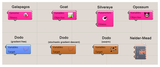 In this section, existing single objective optimization tools for grasshopper (GH) (available in www.food4rhino.com) are reviewed. Algorithm applications for specific optimization problems (such as topology optimization for structure) are not considered. In this context, Galapagos, Goat, Silvereye, Opossum, Dodo, and Nelder–Mead optimization plug-ins, shown in Figure 2, are explained. Some of these plug-ins have been compared in building optimization problems in the literature, that can be found in [12,13,14,15].