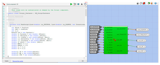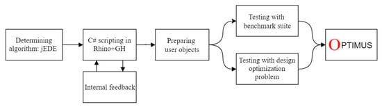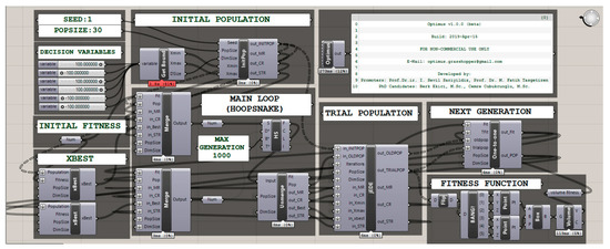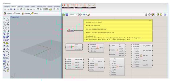 Optimus is a new optimization plug-in (https://www.food4rhino.com/app/optimus) developed for GH. The beta version (1.0.0) of the plug-in implements the self-adaptive [42] differential evolution algorithm with ensemble of mutation strategies [43] (jEDE). The algorithm is coded in C#, which is one of the available programming languages for custom scripting component in the GH. Optimus is based on a modular approach with many C# items. Every step of the optimization process can be observed within these items. Figure 4 shows the eight components of Optimus, which are categorized under three main titles, as follows: