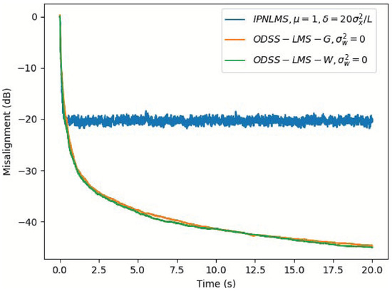 Finally, the overall computational complexity of the NLMS [1], IPNLMS [4], and JO-NLMS [24] algorithms is summarized for comparison. The NLMS algorithm consists of multiplications, additions, and 1 division, while the IPNLMS algorithm involves multiplications, additions, and two divisions. The JO-NLMS algorithm has a computational complexity similar to that of the NLMS algorithm, which is based on multiplications, additions, and one division. Notice that the computational complexity of these algorithms has been reported by considering , , and parameters known, while their estimation depends on the implementation (e.g., in literature, different estimation methods are available). Of course, these algorithms do not involve matrix operations and the computational complexity is . At this point, it can be highlighted that the computational complexity of the ODSS-LMS-W algorithm is comparable with the complexity of the NLMS, IPNLMS, or JO-NLMS algorithm.