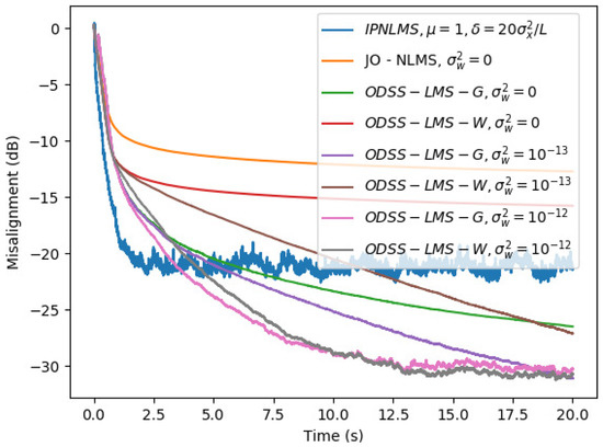 Beyond this, the simulations are performed considering a stationary correlated input signal. In the context of acoustic echo cancellation configuration, Figure 5 shows the performance of the IPNLMS, JO-NLMS, ODSS-LMS-G, and ODSS-LMS-W algorithms in a scenario where the input signal is an AR(1) process, with . It can be observed that, for high values of , it takes control in Equations (19), (24), (26) and (27)–(29) through , and both ODSS-LMS algorithms behave similarly.