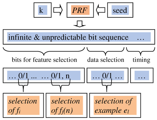 We now have an arbitrarily long vector of secret bits PRF(k, seed). From this we draw in sequence three bit vectors: (1) bits used to select features and feature parameters, (2) bits used to select training examples and (3) bits that affect system timing and other implementation-level parameters.