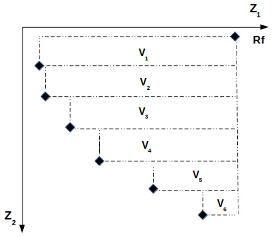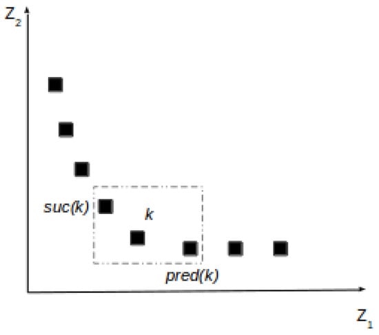 and are respectively the successor and the predecessor solution of the one in the sorted front (see Figure 1). (respectively ) corresponds to the worst (respectively best) value of objective c, with . For the extreme points in all fronts, the crowding distance is set to ∞.