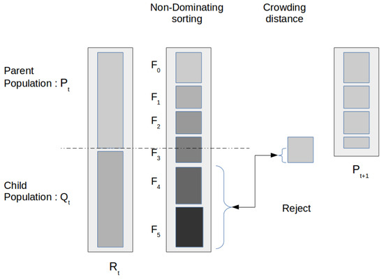 The population update is illustrated in Figure 2 designed by Deb et al. [64]. Let t be the population rank. First, a population and the offspring population are merged to obtain a population of size . is then sorted out according to the non-domination criterion. Solutions in front are obviously of better quality and have to be conserved in the following population. However, if the size of the front is bigger than , only a part of the front is kept. In the case where the size of is strictly less than , the population has to be completed with solutions from the following fronts. In both cases, the choice is based on the crowding distance measure taken in descending order.