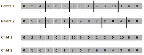 Since the number of routes is related to the number of available vehicles (which is limited to ), the number of crossover points is equal to the number of used vehicles. In the case of an empty route (which means that the route is not opened for the corresponding vehicle), the child route will be a copy of the parent route.