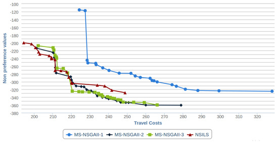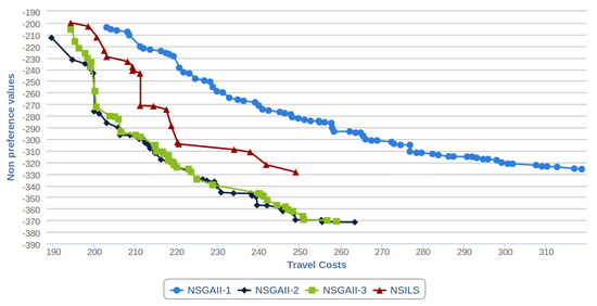 Figure 6 shows that hybridization with local search was necessary to obtain efficient solutions. Here for example, NSGAII-2 decreased the best travel cost of NSGAII-1 by approximately 73% (from ∼320 to ∼265) and the best non-preference by 5% (from ∼−200 to ∼−210). Thus, NSILS decreased the best travel cost of NSGAII−2 by approximately 5% (from ∼ 265 to ∼ 250). Moreover, several efficient solutions were obtained, and they were better spread, thus providing the decision maker with a wider choice.