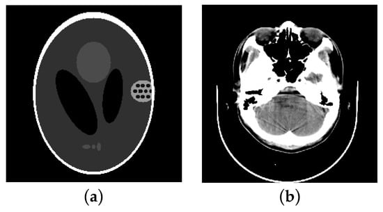 Head phantoms for simulation: (a) The 128th slice of modified 3D Shepp–Logan head phantom; (b) a selected slice of head phantom.