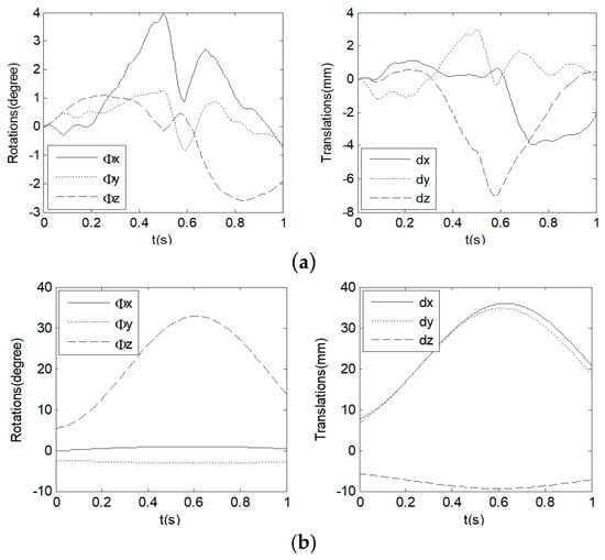 The projection data were obtained by applying the motion to a phantom during the scan. Figure 3 shows the motion segment that was used in the simulations. The slight motion of up 4° and 7 mm for rotations and translations obtained by Kim et al. [] (a motion segment in Figure 15 of []) are presented in Figure 3a. Figure 3b shows the large motion exceeding 30° and 30 mm, which is much larger than that typically expected in patients [].