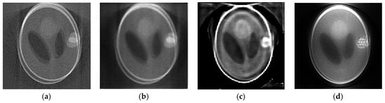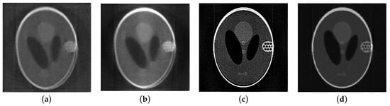 For the numerical simulations, the modified three-dimensional version of the Shepp–Logan phantom was used to simulate the CBCT system. The additional tiny circles in the 128th slice of modified 3D Shepp–Logan head phantom are used to simulate the small tissue, as shown in Figure 2a. The size of the phantom was 256 × 256 × 256 voxels and the display window was [0 HU, 1000 HU]. The scanning time was set to . The interval angle was 1°, and the number of projections was 360. The distance from X-ray source to detector was 100 cm and source to object was 50 cm. Poisson noise was added to the raw simulated data before the reconstruction (assuming that 10,000 photons were detected on each detector element in the blank scan).