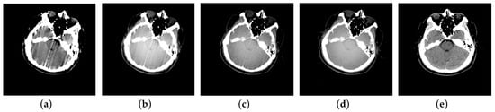 In the following simulations, the proposed method was verified on head phantom. A selected slice of head phantom was shown in Figure 2b. The sinogram was acquired from head phantom with motion and noise that were the same as the Shepp–Logan phantom experiments. The head CT image was acquired from a GE Hi-Speed multi-slice CT scanner. A total of 720 views were uniformly selected over a 360° range under 150 mA X-ray tube current and 120 kVp. The display window was [−5 HU, 75 HU]. All of the reconstructed images (512 × 512 pixels) were reconstructed by the OSEM method with three iterations and 30 subsets. BD-iterations were stopped at the sixth iteration. The other experimental parameters were set the same as those of the Shepp–Logan phantom experiments.