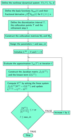 be the collocation matrices of the basis functions and of their fractional derivative, respectively. Let be the vector-valued function whose entries are the equations of the nonlinear system (14). Then, the nonlinear system can be written as