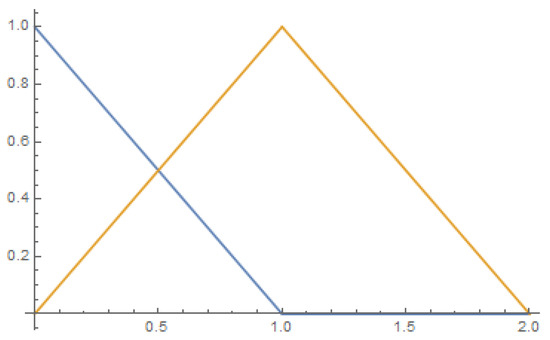 The left-edge function (blue) and the linear cardinal B-spline (orange).