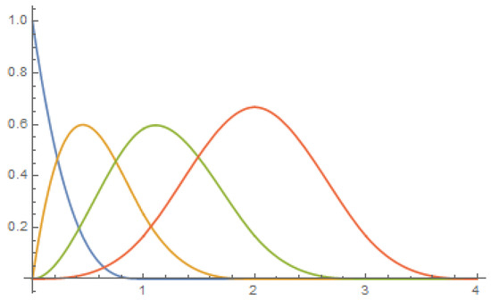 has just one left-edge boundary function, i.e., , and interior functions, i.e., , , where . Obviously, T and h must be chosen in order . The explicit expression of the basis functions is well known and is given by