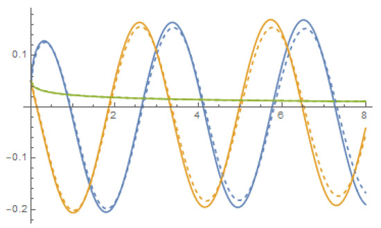 The numerical solution for (solid lines) and (dashed line) of the nonlinear dynamical system (38). In both cases . The first, second and third entries of the vector are displayed in blue, yellow and green, respectively.