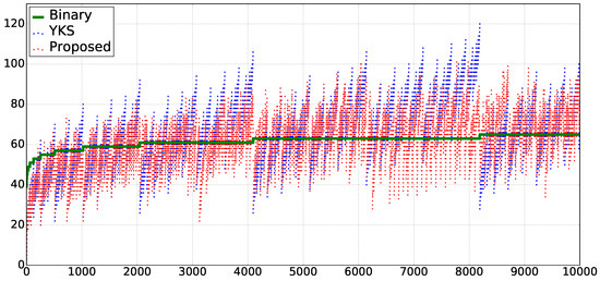 Figure 1 and Figure 2 show the experimental results. In both of them, “Binary”, “YKS”, and “Proposed” denote the methods using the binary expression on -terms, YKS, and ours, respectively. The horizontal axis shows the repetition number n of given text . Then, we compare the sizes of the generated extended -terms by using these three methods, for the given .
